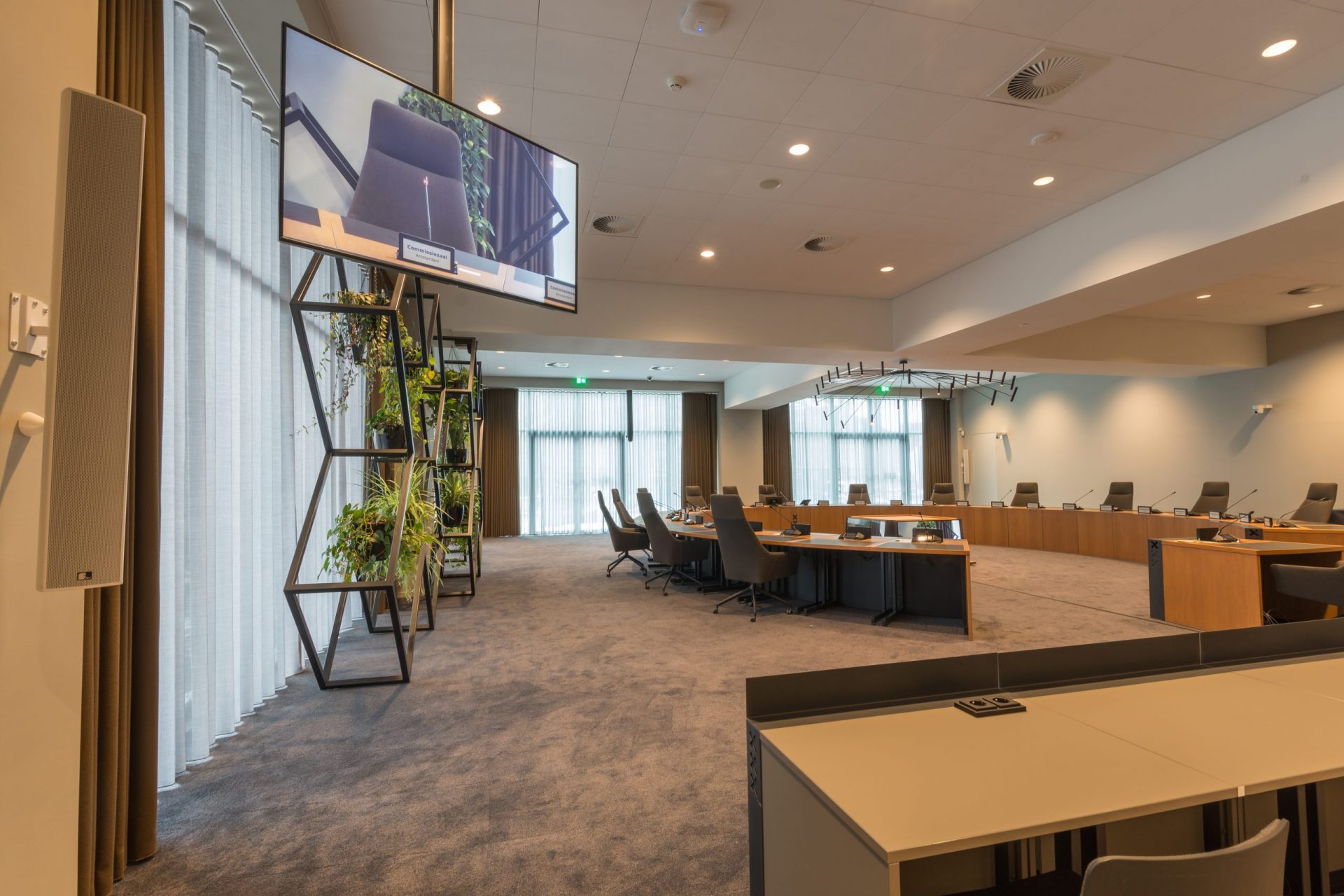 De Commissiezaal is een uitbreiding op het bestaande stadhuis. Deze zaal heeft een discussiesysteem bestaande uit 32 posten. Uniek aan dit systeem zijn de digitale naambordjes met de naam van de deelnemer alsmede de politieke partij aan de vergadering. Ook deze zaal heeft een cameravolgsysteem om de deelnemers persoonlijk in beeld te brengen. De beelden worden op meerdere displays in verschillende formaten weergegeven in de Commissiezaal, Persruimte, Foyer én de publiekstribune. Bediening van de apparatuur in beide zalen gaat door middel van touchpanels.